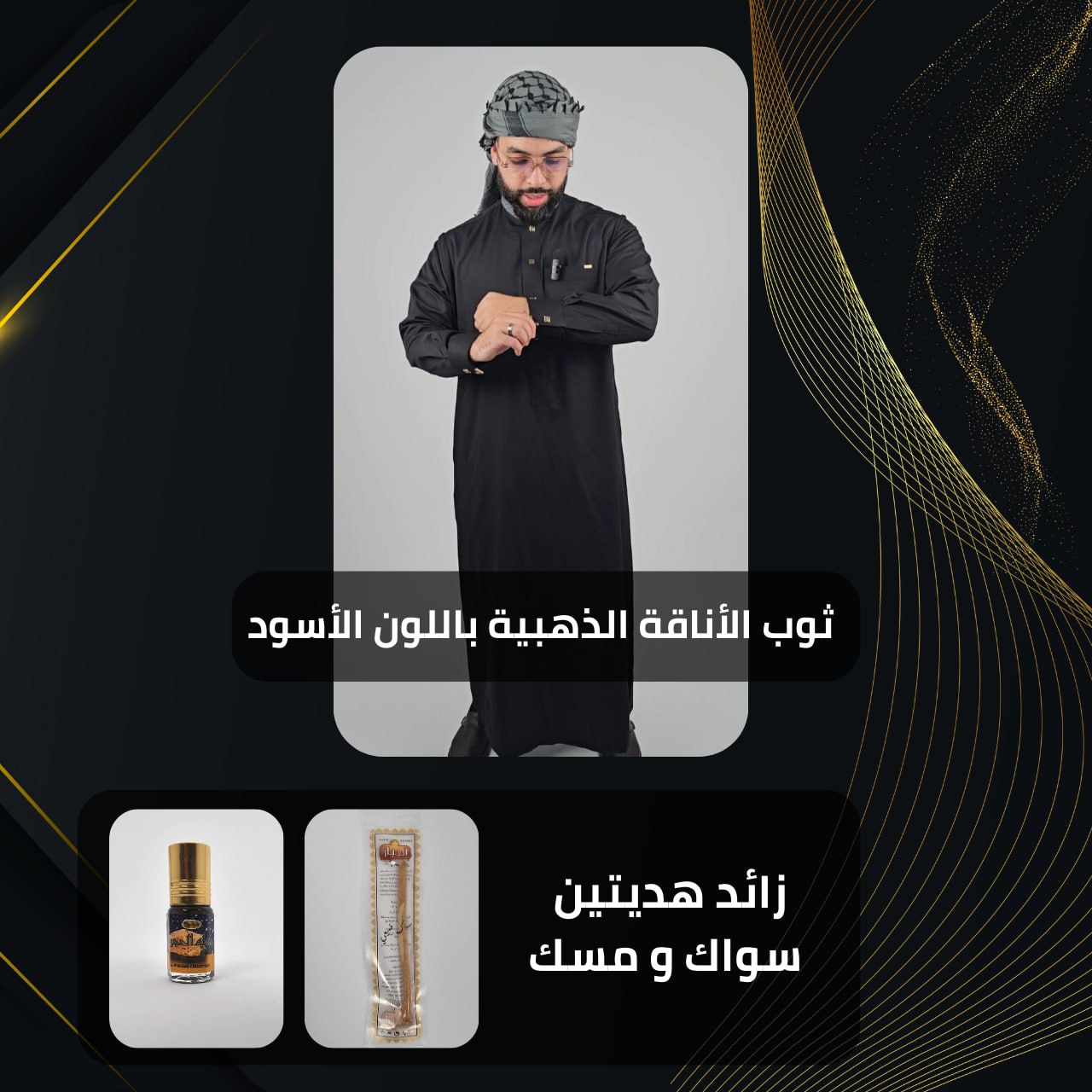 زين إطلالتك مع ثوب الأناقة الذهبية، تصميم ولمسات أنيقة.خامة مريحة وتقنية تفصيل سعودية.مع هديتين صغيرتين: سواك ومسك.اطلب الآن واحصل على قميصك.