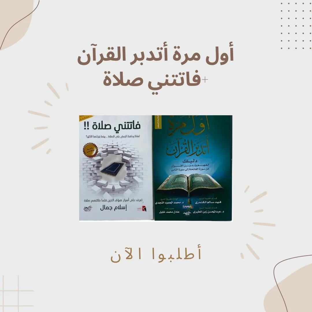 المجموعة مكونة من : كتاب فاتتني صلاة نسخة اصلية وشرعية *1 عدد الصفحات : 214 كتاب اول مرة اتدبر القرآن نسخة اصلية وشرعية *1 عدد الصفحات : 367 الكتابان الذان يمكن أن يكونا سببا في قلب موازين حايتنا للأفضل! فاتتني صلاة كتاب يغير مفهومنا عن الصلاة ويبين لما قيمتها الحقيقية وأثرها علينا وربطها العجيب مع حياتنا اليومية أول مرة أتدبر القرآن هو دليلك لفهم وتدبر القرآن الكريم من سورة الفاتحة إلى الناس بأسلوب بسيط وسهل الكتابان حقا فد يقوداننا نحو نقلة نوعية روحانية يمكنكم طلبهما من موقعنا الآن !