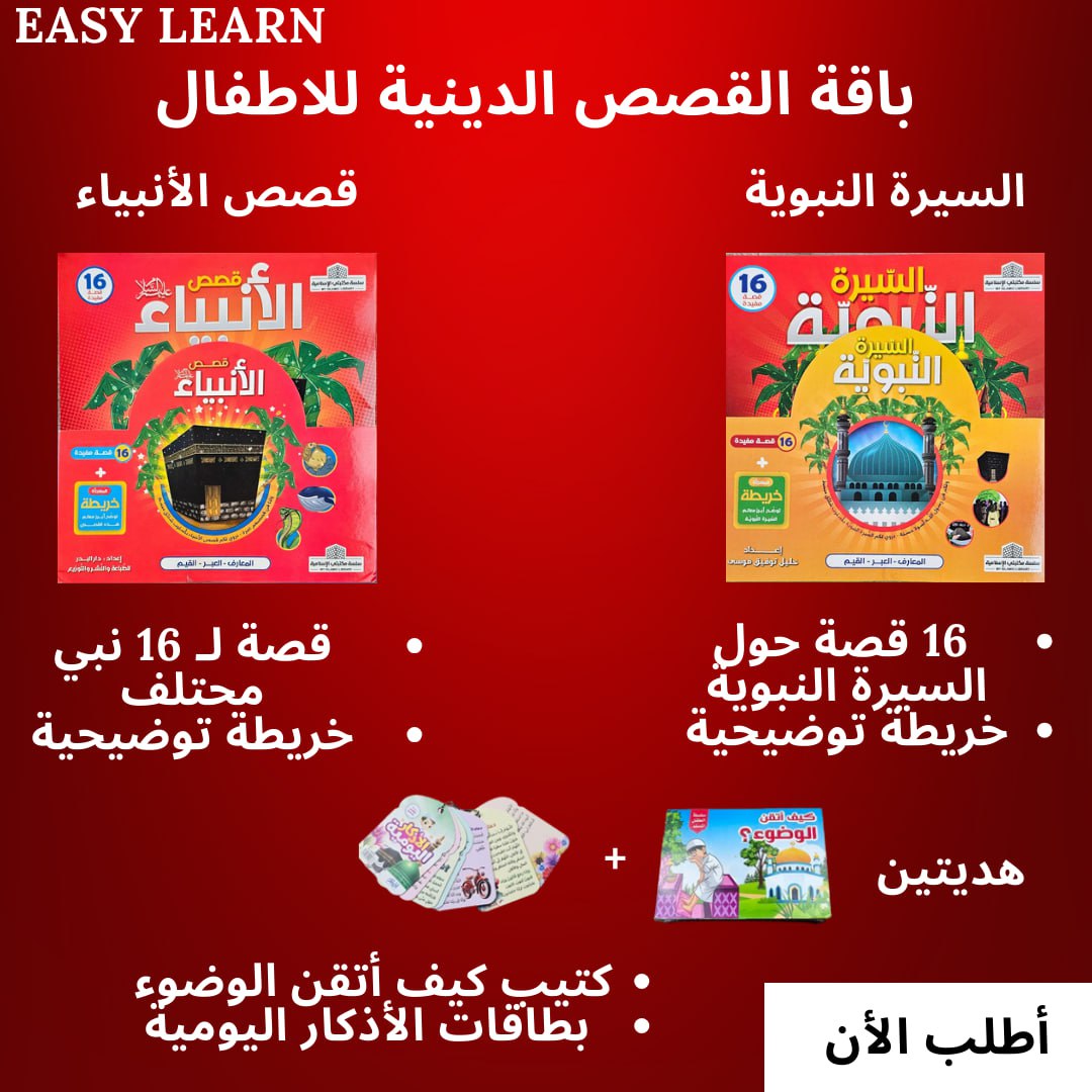 اجعل أطفالك يستمتعون بتعلم السيرة النبوية وقصص الأنبياء بطريقة مشوقة مع باقة القصص الدينية، مجموع 32 قصة شيقة تأتينا في 16 كتاب مع خريطتين توضيحيتين , العرض فيه قصص من قصص الأنبياء عليهم السلام وقصص حول السيرة النبوية وهديتين مميزتين كتيب كيف أتقن الوضوء وبطاقات الأذكار اليومية، اطلبها الآن!